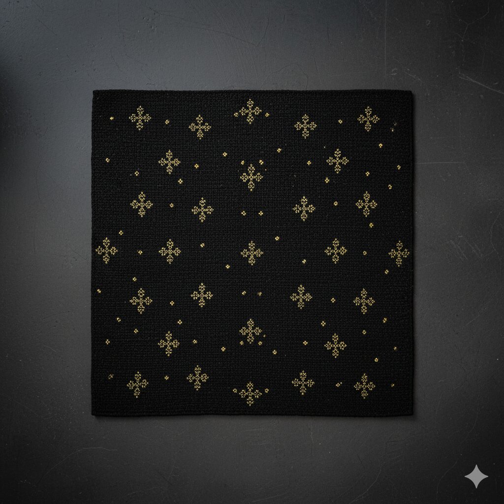 A touch of celestial elegance. This rug features a deep black cotton background with scattered, star-like geometric motifs woven in a shimmering golden-yellow thread. Perfect for adding a touch of drama and magic to a special space.